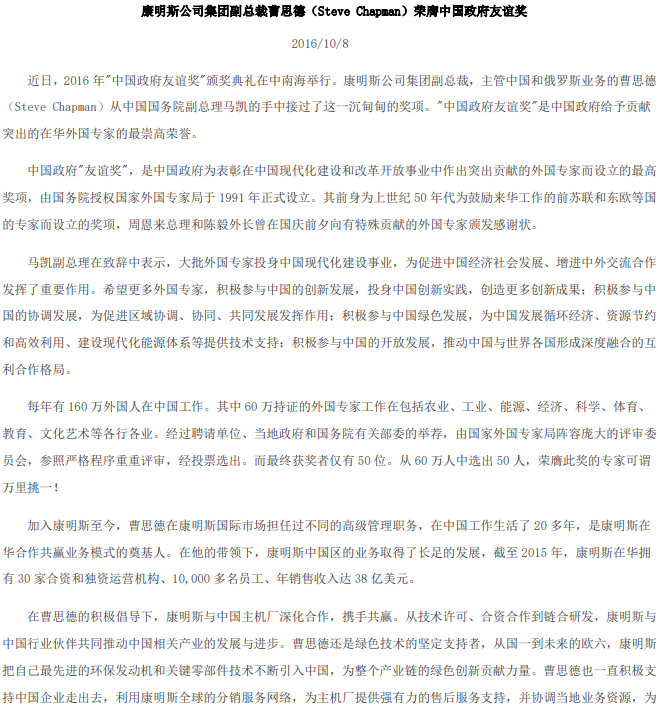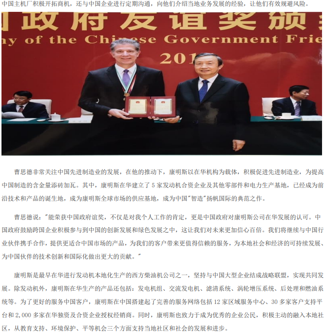 康明斯公司集团副总裁曹思德(Steve Chapman)荣膺中国政府友谊奖